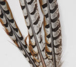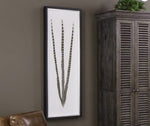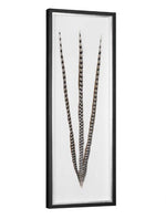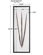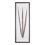 Featuring a spray of natural pheasant feathers in tones of brown and black placed atop an antique white canvas background. This display is showcased in a shadow box frame made of pine wood with a soft black finish and contrasting silver leaf inner edge. Artwork is under glass.