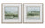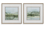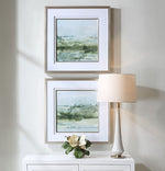 These abstract watercolor landscapes showcase calm shades of green, from olive to sage. The prints are complemented by a brushed champagne gold frame with matching fillet, double white mats and a protective glass.