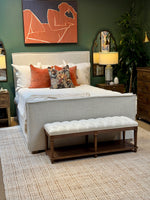 Traditional details on the legs of the Juliette Bench combine with a tufted linen upholstered top to create the ultimate bench! This bench is a perfect choice for seating at the foot of a bed, under large scale art, or in front of a cozy fireplace. Fabric : Alabaster linen Finish : Walnut