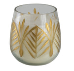 This leaf pattern round soy wax candle brings a touch of nature as well as luxury to any room. The softly rounded gold cut glass vessel is adorned with an artistic leaf pattern. The metallic leaves shine warmly with the light of the scented candle within.