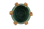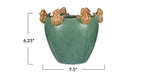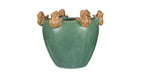 This planter features a round shape and a smooth texture, with two adorable frogs sitting on the edge of the rim. The planter has a reactive glaze finish that gives it a stunning and unique look, with shades of green and yellow blending together in a beautiful pattern.