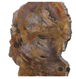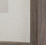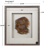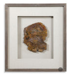This shadow box style wall decor features a polished slice of petrified wood, set under glass in a dark walnut finished wood frame with a light beige linen background. Due to the authentic nature of the wood, each will vary in color and size.