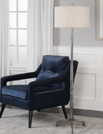 Tapered cast iron with a subtle textured surface, with a raw steel finish and burnished distressing. The round hardback drum shade is a light beige linen fabric with natural slubbing.