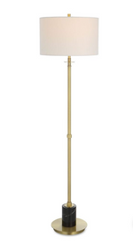 This sophisticated design showcases a sleek iron base finished in a lightly antiqued plated brass, accented by a substantial black marble column above the foot. The round hardback shade is covered in a white linen fabric.