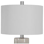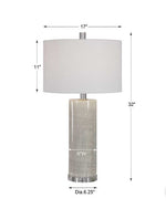 Modern in design, this ceramic table lamp showcases a neutral beige glaze with an abstract gray drip pattern, paired with elegant crystal details and polished nickel plated accents. The hardback drum shade is a white linen fabric.