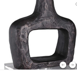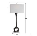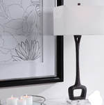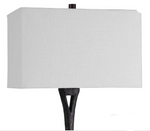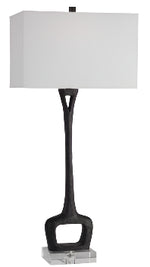 This cast iron table lamp is finished in a masculine aged black with a heavy organic texture displayed on an elegant crystal foot. The lamp is paired with a rectangular hardback shade in a white linen fabric with vertical slubbing.