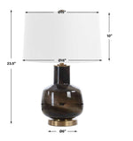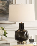 This Lamp showcases a smokey charcoal glass, accented with plated brass details that conveys a sense of opulence. The slightly tapered round hardback shade is covered in a white linen fabric.