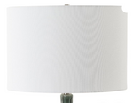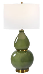 This timeless gourd shaped ceramic base is finished in a moss green glaze accented with lightly antiqued brass plated details. The round drum shade is made of white linen fabric. Due to the nature of fired glazes on ceramic lamps, finishes will vary slightly.
