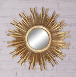 Bold and eye-catching, this round mirror showcases a golden sunburst design. Looks great in a foyer, to create a shimmering focal point, or as a complement to an eclectic and artful gallery wall. The gold finish provides an antique look. This mirror complements a contemporary or a transitional decor.