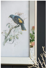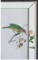 Perfectly capturing the tranquil beauty of nature, this set is comprised of two separate scenes of songbirds, boasting vibrant green and blue hues respectively. Completing the modern visuals, a gleaming silver mirrored frame surrounds the birds, creating a bold, intriguing focal point for any room in your home.