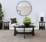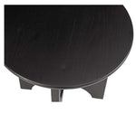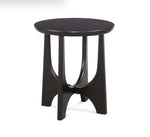 The Dunnigan End Table features modern styling with an organic architectural inspired design. The flat-cut oak wood is finished in a black matte stain. The base design features curving on the inside and straight on the outside for a unique look. Also included are adjustable floor levelers for an even balance.