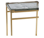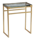 The Radley Accent Table features a cast glass top surrounded by a gold finished metal base with rivet accents at each corner. In these hand-crafted pieces, you will find deeply imbedded bubbles, vailing and textures as well as some surface distortion as each piece has a unique appearance and will vary slightly. Finish: gold. Material: metal, cast glass.