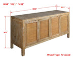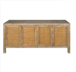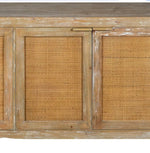 Crafted from fir wood and rattan, this console blends organic textures with timeless charm. The natural wood frame showcases a distressed finish for a rustic touch, while the woven rattan-paneled doors add warmth and dimension. Behind its four doors, spacious storage keeps essentials neatly tucked away, making it a stylish yet functional addition to any entryway, dining space, or living area. With its airy, coastal-inspired appeal, this console brings an effortless sophistication to your home.