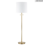 Our contemporary Eliza Floor Lamp will elevate your decor with its crisp and stylish design. This modern-style stick floor lamp boasts a luxe gold finish and is paired with a classic white linen drum shade for a clean aesthetic. Standing at 68 inches tall, it's ideal for larger spaces. Equipped with two classic pull chain on/off switches, it's constructed with sturdy metal on a steady, heavy-weighted lamp base for durability and stability.