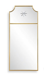 Inspired by Trumeau styling, this updated traditional mirror displays a petite stainless steel frame finished in satin brushed brass, displaying an etched medallion motif. This mirror adds a touch of elegance to any room, be it an entry hall or a powder room, and it also looks stunning behind bedside tables in a bedroom.