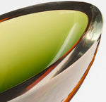 Expertly handblown art glass and features striking layering in rich green and orange hues