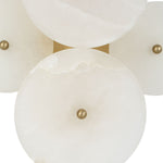 Seven discs of illuminated alabaster are held in place by a rich brass-finished button detail. Given the nature of the natural alabaster discs, some will be more opaque while other will contain more dark veining, creating a truly unique glow which can mount vertical or horizontal with 2-60 watt max candelabra sockets. Featuring a 4" extension from the wall this refined sconce is also ADA compliant
