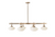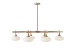 White art glass shades with jewel-like bubbles are reminiscent of droplets of water. They are attached from brass-finished tapered caps suspended through rectangular spokes. 6-60 watt max, candelabra sockets.